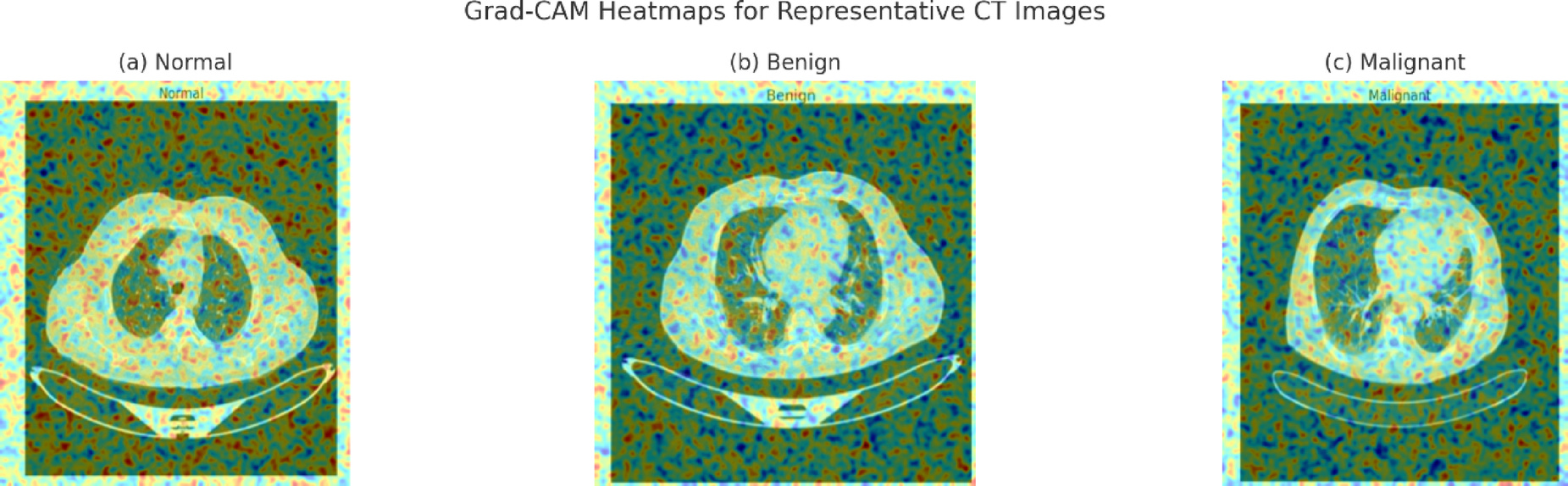 Grad-CAM Visualisations for a Subset of CTExamples (a) Grad-CAM visualisations (displayed in Fig. 15) for a set of CT examples. As is usual (a), the lung tissue is activated diffusely and corresponds to the absence of lesions. In the benign case (b), we observe localised nodular regions but no aggressive spreading elsewhere. In the malignant case (c), however, the activations would be located around the cloudy nodules and hyperdense margins, a distinguishing feature for breast diagnostics, reaffirming the clinical relevance of the explanation results.